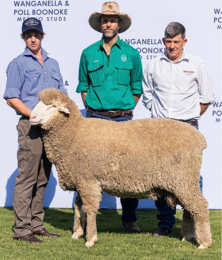 Sold $15000 to Willandra Merino Stud, Jerilderie, NSW. Photographed with Lachie Barrett, AFA, Ross Wells, Willandra Stud Principal, Chris Bowman, Willandra Stud Classer, and Caroline Heath, Willandra Stud Principal.
